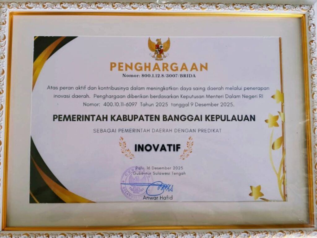 PALU – Pemerintah Kabupaten Banggai Kepulauan resmi menerima penghargaan sebagai Pemerintah Daerah dengan predikat “Inovatif” dalam ajang apresiasi inovasi daerah tahun 2025.